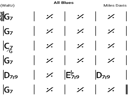 All Blues By Miles Davis "All Blues" est une composition jazz de Miles Davis, apparue pour la première fois sur l'influent album Kind of Blue, sorti en 1959. Dans le livret original, le pianiste Bill Evans décrit le morceau comme "une forme blues à 6/8 et 12 mesures qui produit son atmosphère grâce à quelques changements modaux et à la conception mélodique libre de Miles Davis". (1) Interprétations Tutorials Backing tracks |